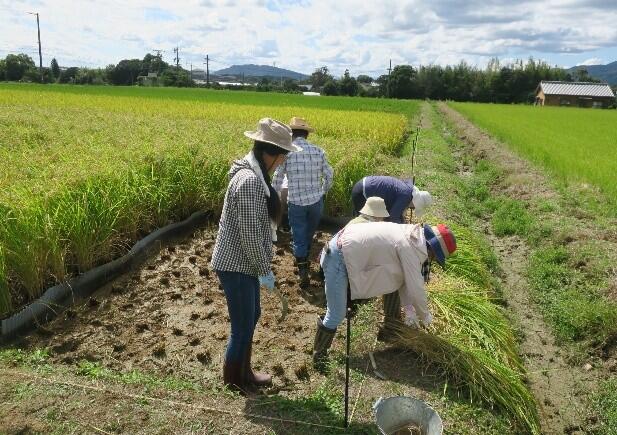 第6回は「稲刈りと冬野菜の定植」を実施し、参加者は冬野菜としてイチゴの苗の定植の後、稲刈りの体験を行いました。