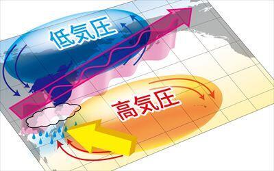 (オホーツク海上空の低気圧の下には地上のオホーツク海高気圧がある)高気圧と低気圧をまわる青と赤の細線は気流の流れを示す