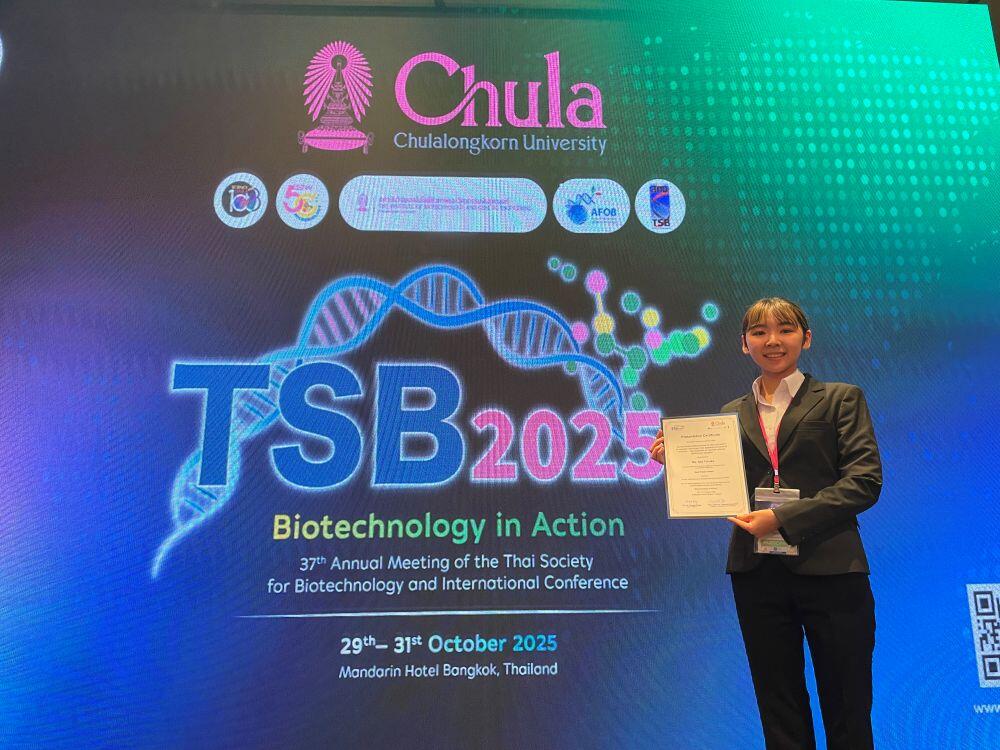 The 37th Annual Meeting of the Thai Society for Biotechnology and International Conference(TSB2025)(会期:2025年10月29日~10月31日,会場:Mandarin Hotel Bangkokおよびチュラロンコン大学(バンコク・タイ王国))において、本研究科 生物圏生命科学専攻 海洋生命分子化学講座 水産物品質学教育研究分野 博士前期課程2年の田中 咲衣さん(指導教員:岡﨑 文美 准教授)が「Consolidated bioprocessing for the production of valuable chemicals from seaweed processing residues - Development of mannan-utilizing Halomonas elongata」(統合バイオプロセスによる海藻加工残渣からの有用物質生産 -マンナン資化性Halomonas elongataの創製)と題した研究発表を行い、「Best Poster Award」(Session III: Industrial & Environmental Biotechnology & Alternative Energy)を受賞しました。