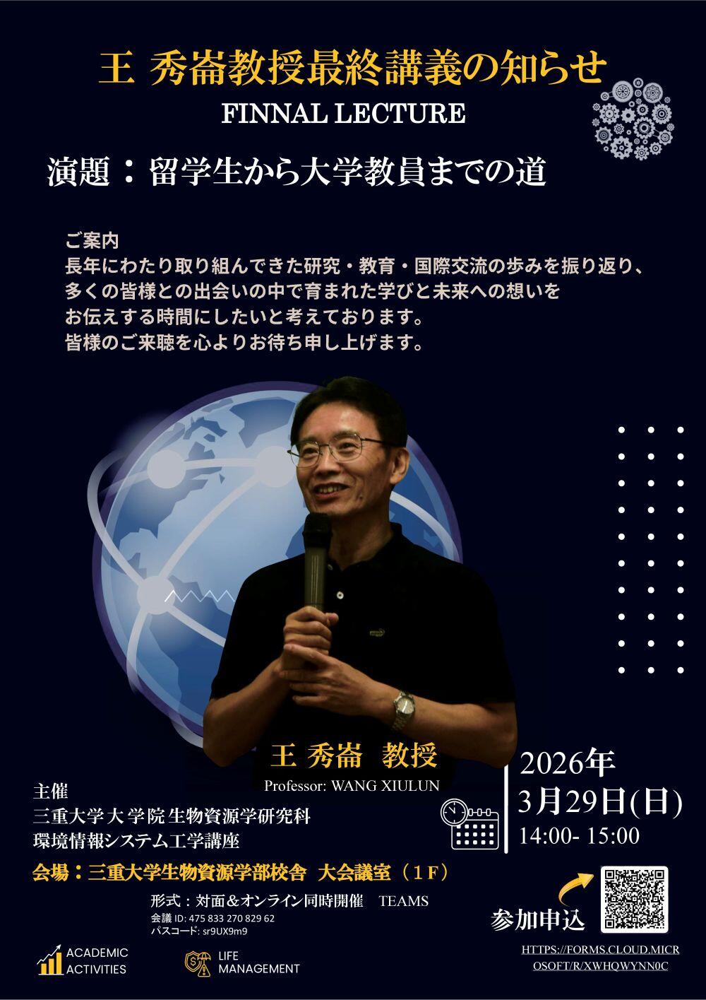 長年にわたり生物資源学研究科において教育研究にご尽力されるとともに、国際交流の推進にも多大なるご貢献をいただきました王秀崙先生は、令和8年3月末日をもちまして三重大学を定年によりご退職される予定です。