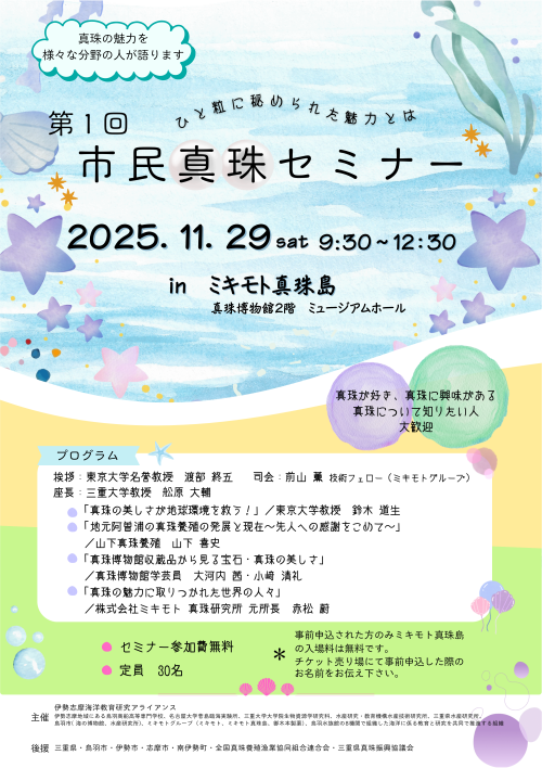 伊勢志摩海洋教育研究アライアンス ※1 主催の第1回市民真珠セミナーについてご案内します。
