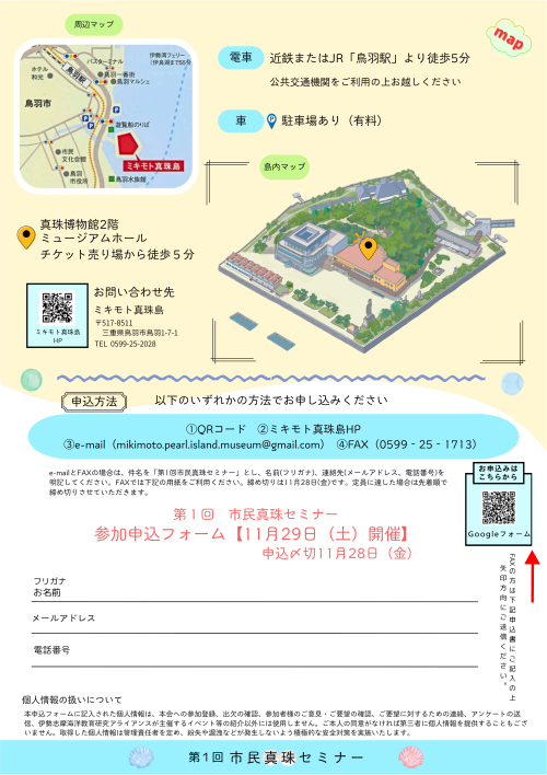 ミキモト真珠島ホームページ、申し込みフォーム(オンライン)、メールまたはFAXにて必要事項をご記入の上、お申し込みください。