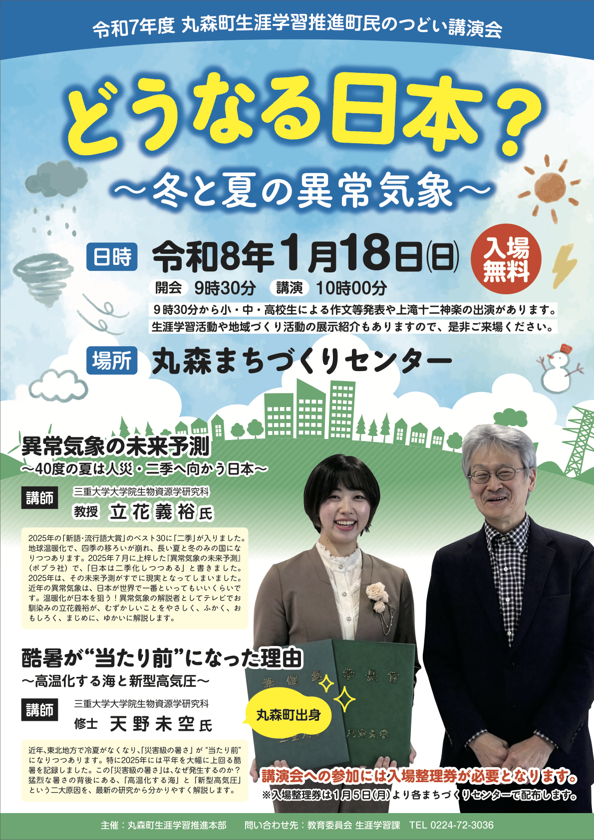 1/18開催された天野さんの故郷である丸森町渉外学習推進本部主催の講演会「どうなる日本?~冬と夏の異常気象~」の模様が1/20放映されます。