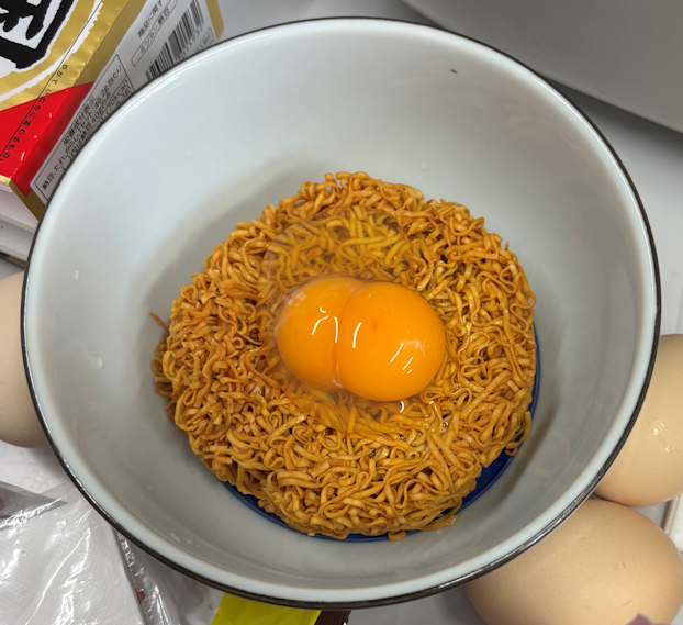 ![]() まずは定番、チキンラーメン |
