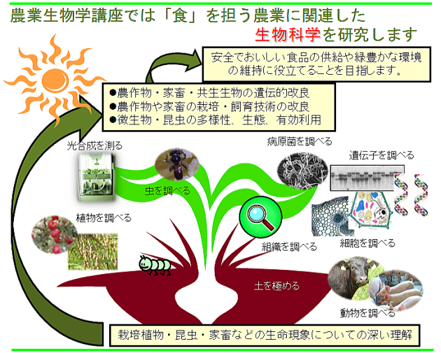 我々人類にとって農業による食料生産は必要不可欠な営みです。また、安全でおいしい食品の供給や地球環境の保護においても農業が重要な役割を担っていることはいうまでもありません。この活動をより安定に、より良くしていくためには栽培植物や家畜などの生命現象について深く理解することが必要です。そこで私たちの講座では、従来の農学の考え方を出発点として、そこから新たに発展した生物科学を様々な視点から追究し、世界的な食料問題の解決や緑豊かな環境の維持に役立てることを目的としています。