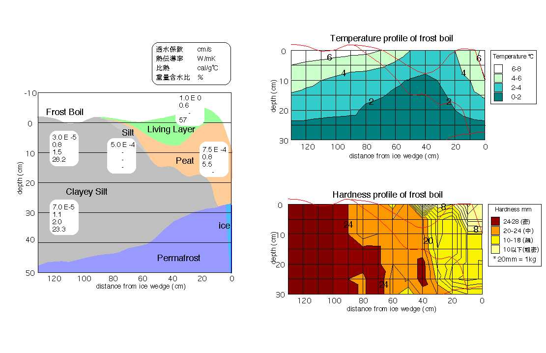フロストボイル-アイスウエッジ間の土中の温度分布と硬度分布(図右)