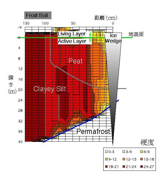 フロストボイル-アイスウエッジ間の土層構造と土質、物理的性質(図左)